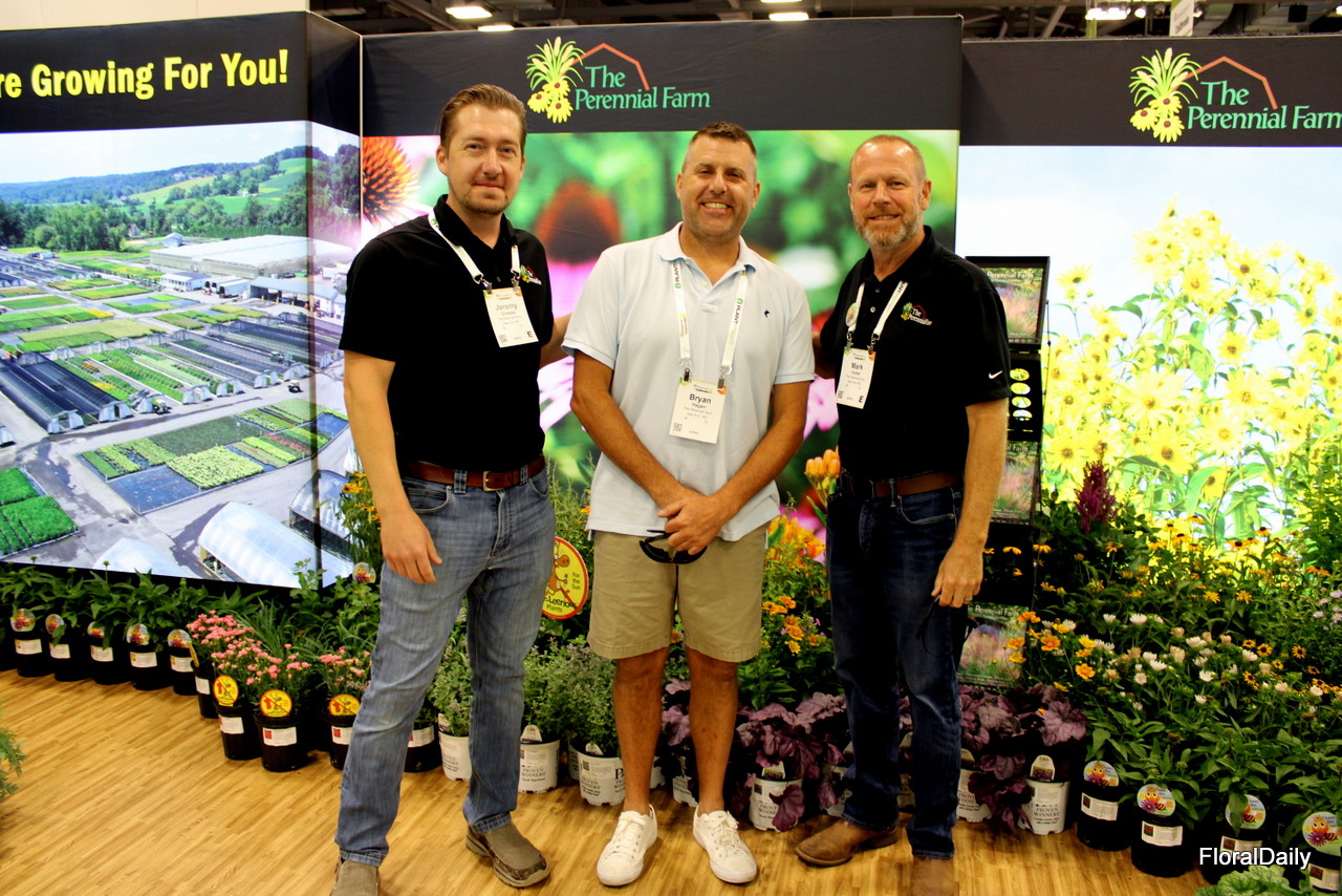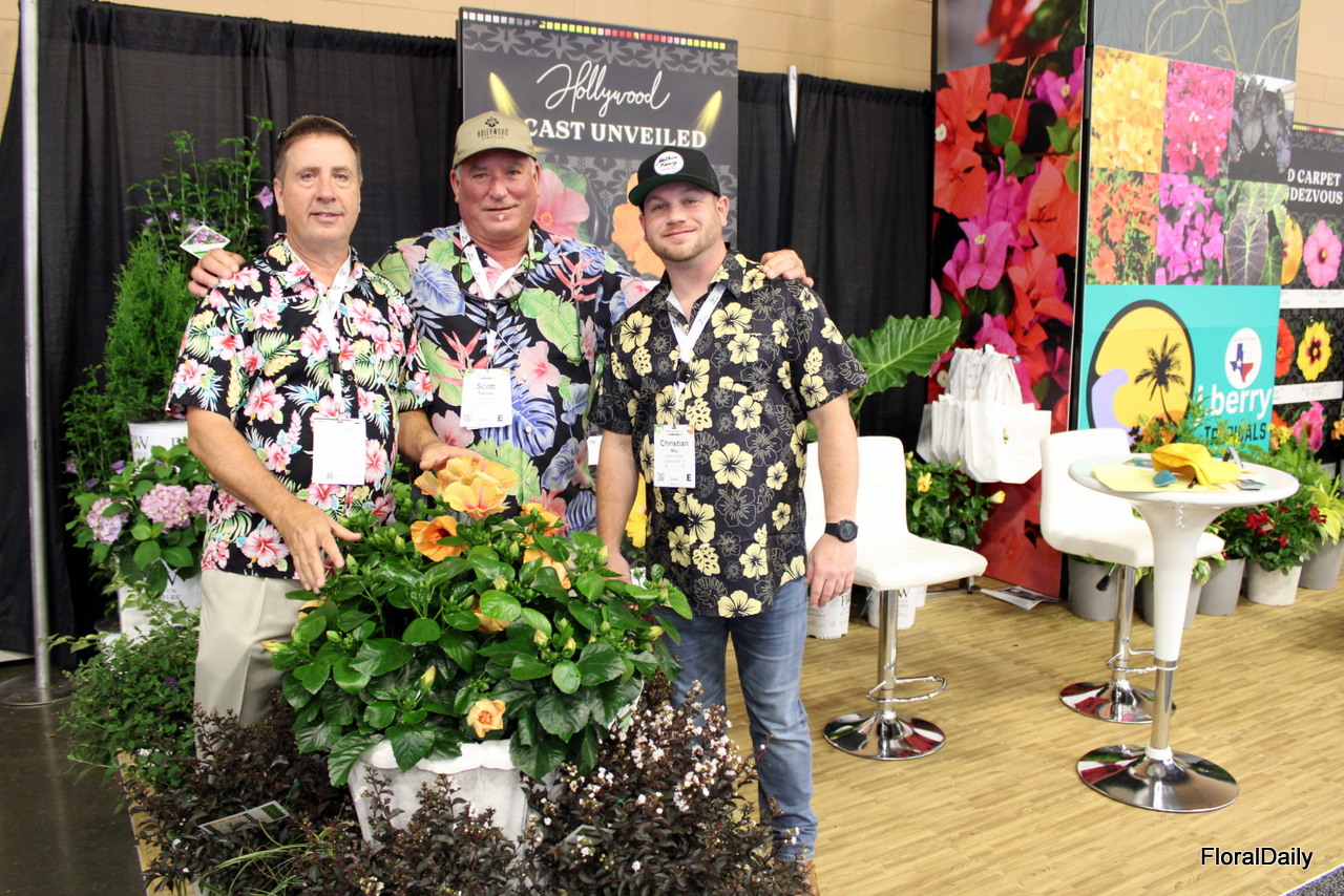Keith Formway, Scott Reeves and Christian May of J. Berry Nursery, showing the Hollywood Hibiscus Disco Diva
