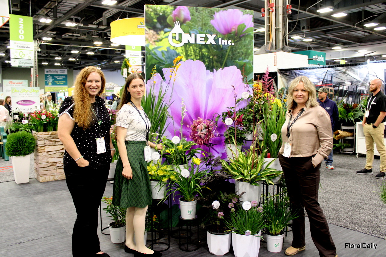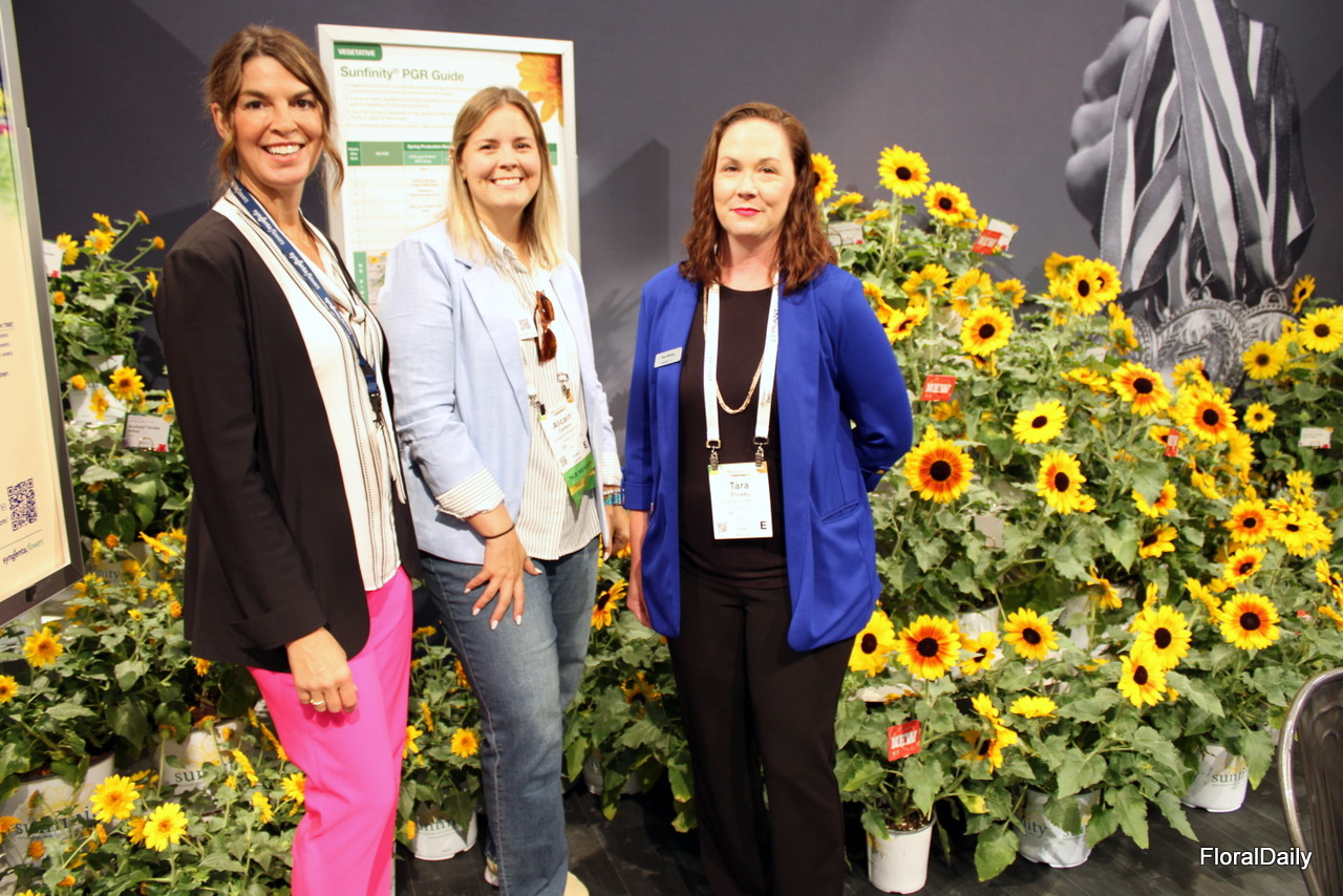 Tara Shosky, Alicain Carlson and Jennifer Barnes of Syngenta Flowers, in front of the new Sunfinity Bicolor Yellow/Red