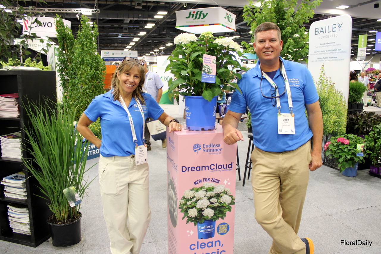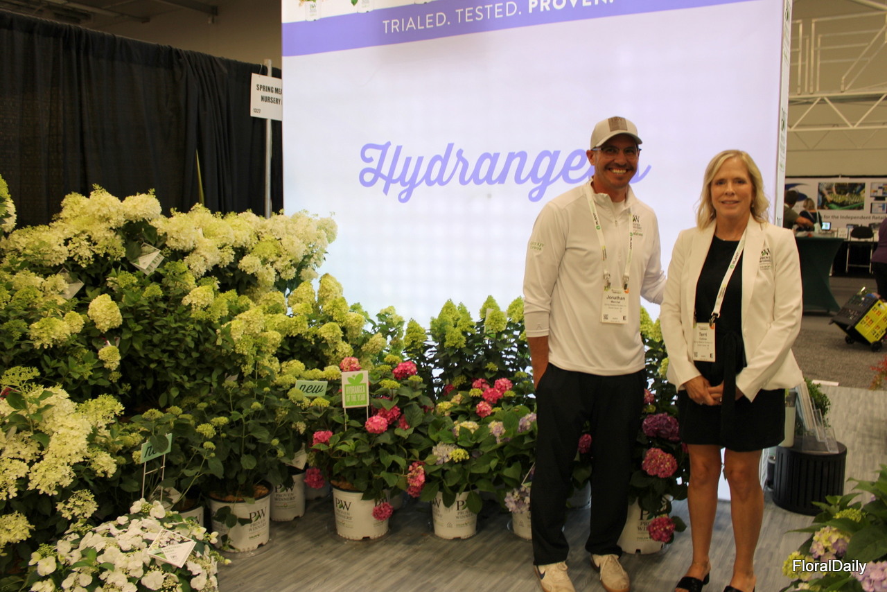 Kim Goodwin and Josh Kight of Bailey Nurseries, presenting the new DreamCloud reblooming hydrangea