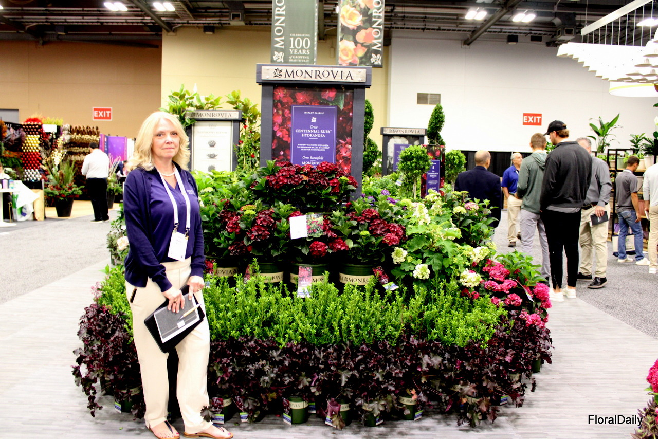 Kari Ryder-Morton of Monrovia next to the Centennial Ruby Hydrangea that was launched to celebrate Monrovia’s 100-year anniversary