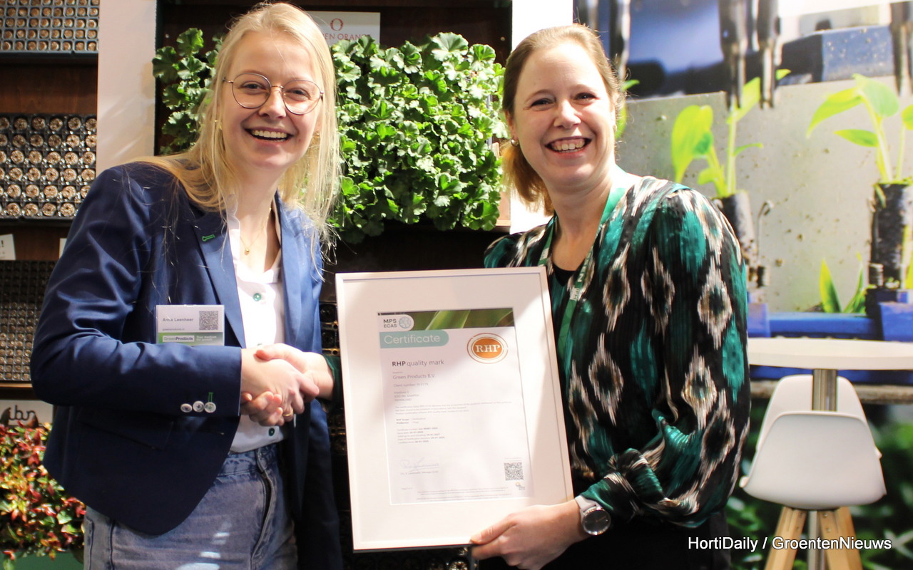 Anne Leenheer, GreenProducts proudly accepts RHP certificate from Martine Holtkamp RHPhttps://www.hortidaily.com/article/9805652/rhp-certification-for-green-products/
