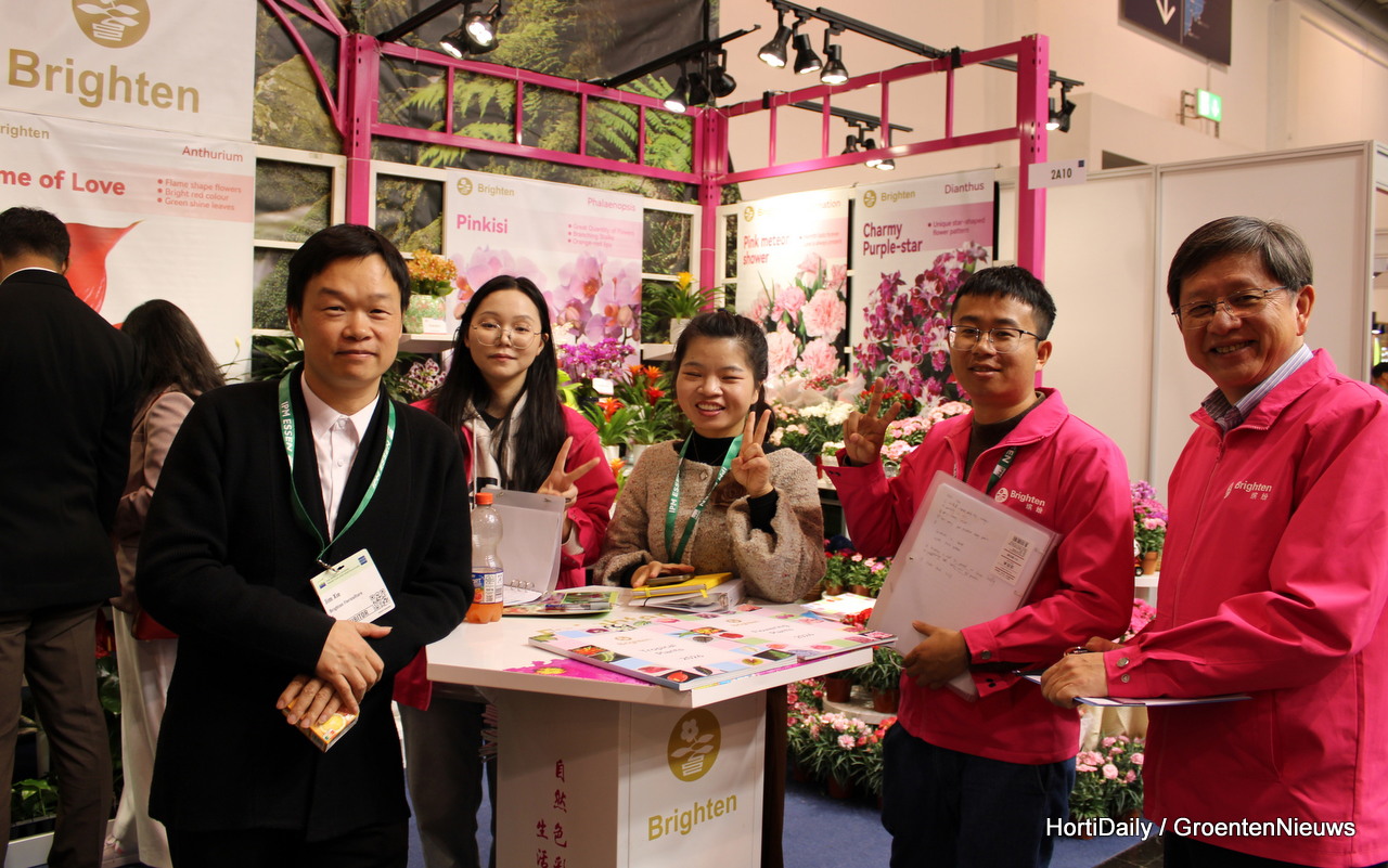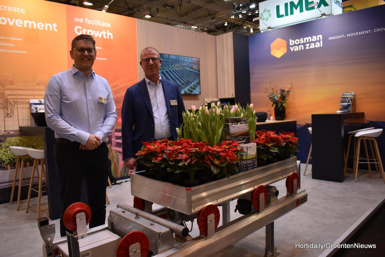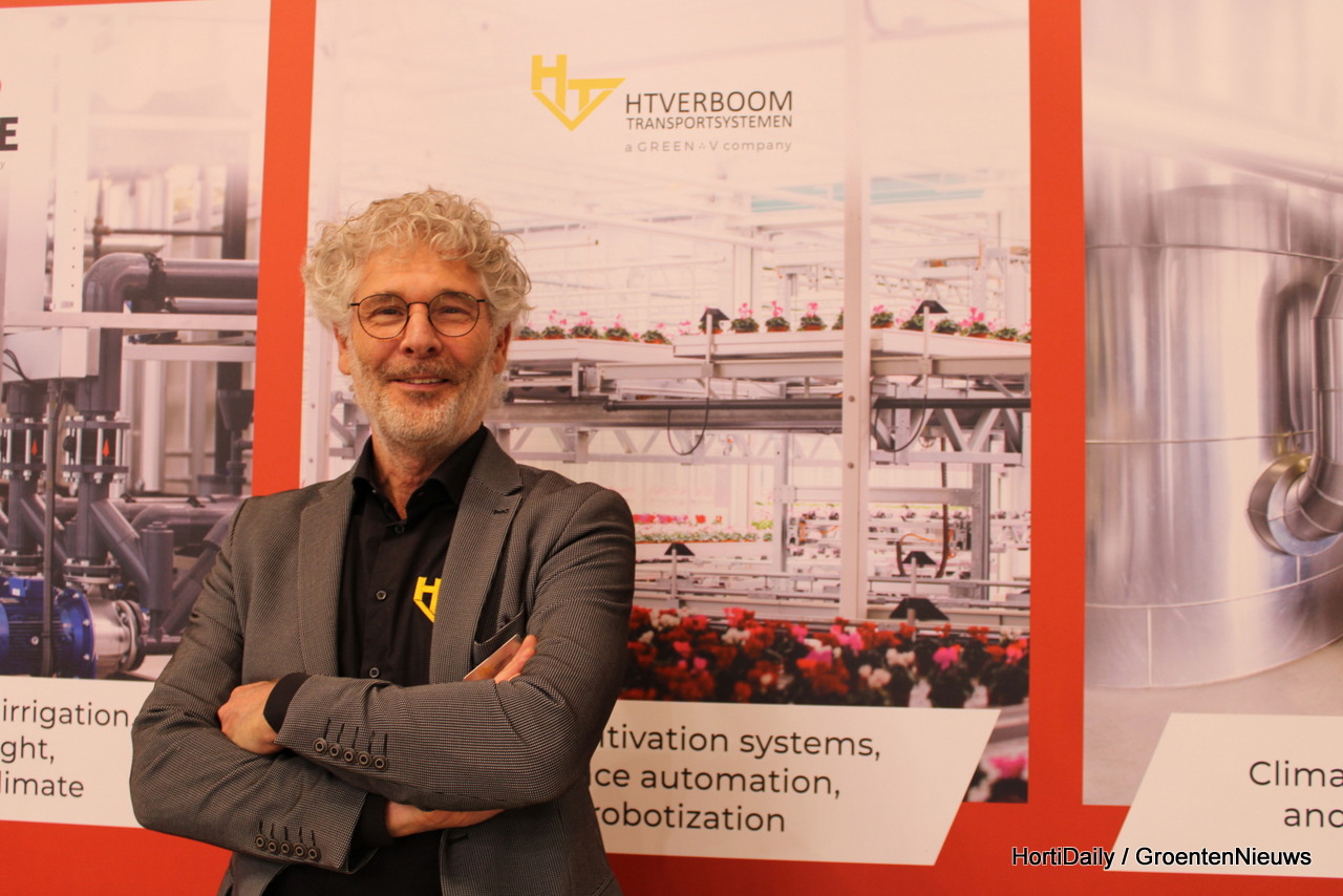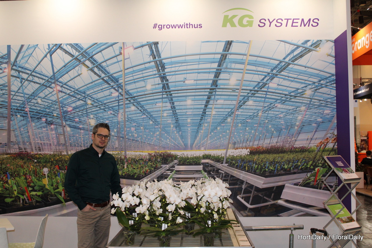 Marco de Koning (KG Greenhouses) stands here with Optiflor's beautiful plants. There, too, KG's tables move through the greenhouse.