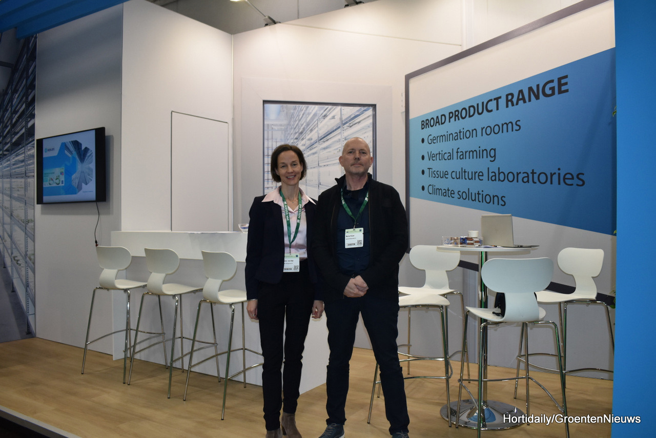 Carole Dumenil and Dieter Kaschube of Ondex show the Ondex Bio concept, where solar-panel-powered fans influence greenhouse temperatures