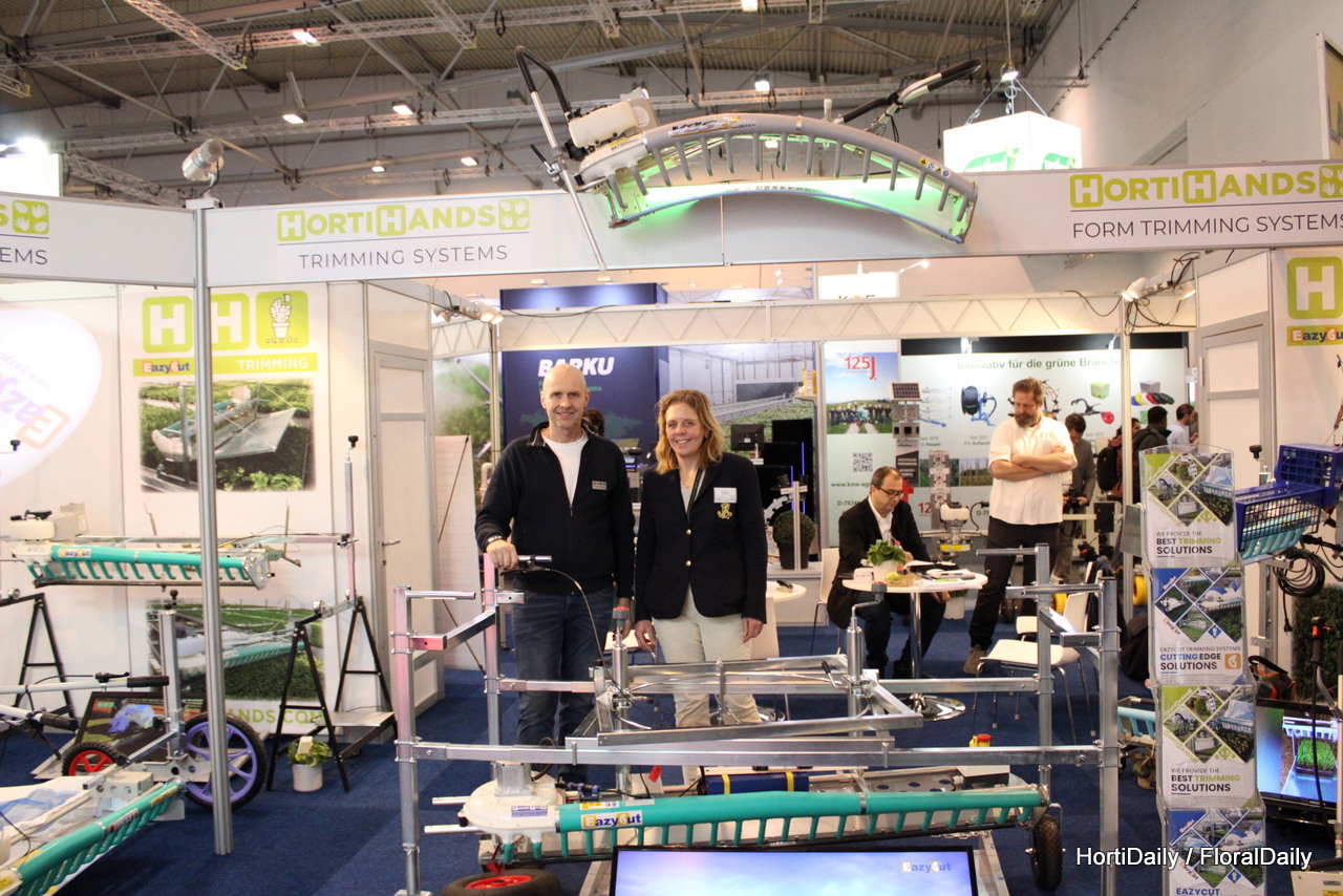 Christian Oosterlaan and Bärbeli van Heek at the fair with the Eazycut cutting machine all the pruning material comes neatly into the bag and not between the crop. This machine has many applications.