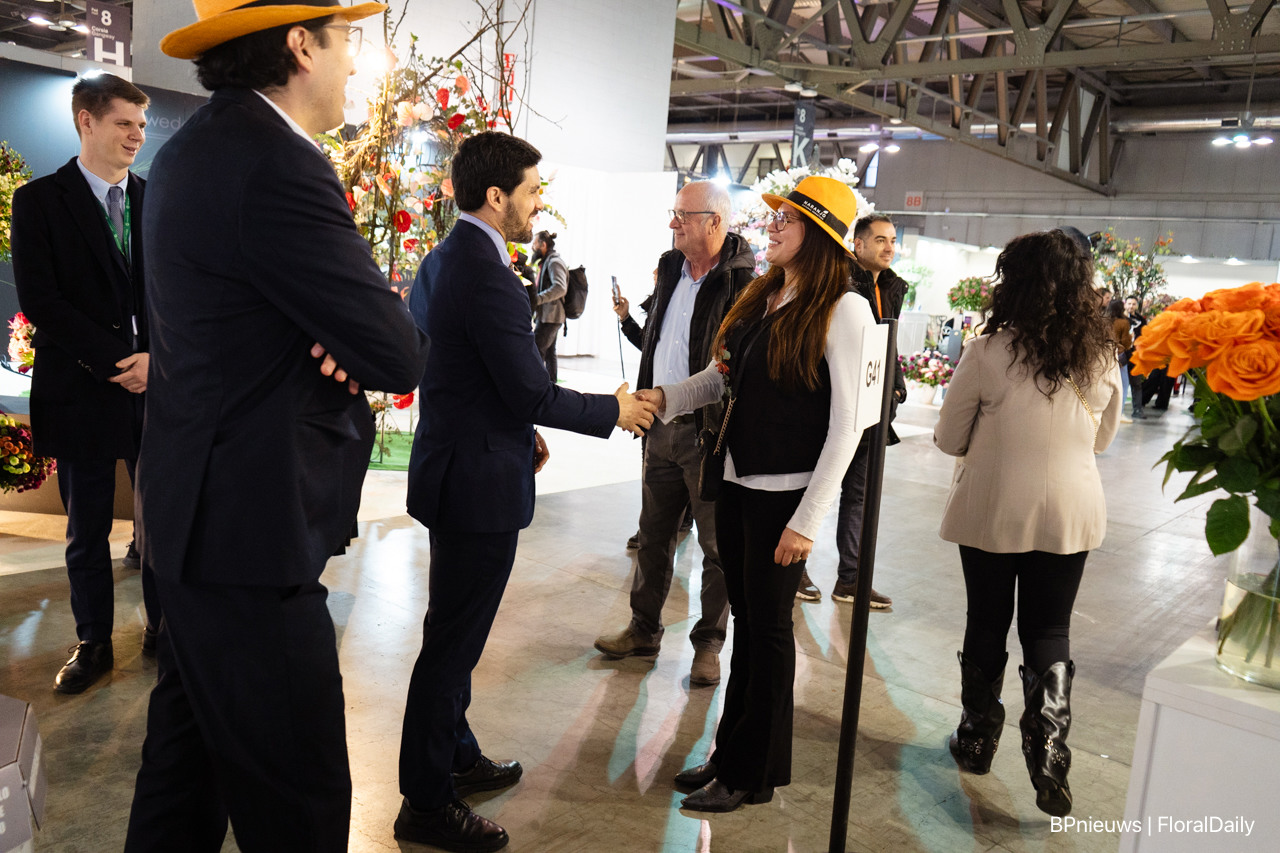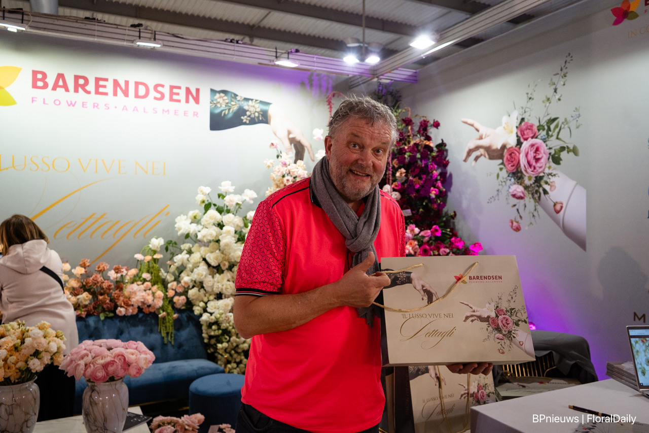 Jan de Boer at the Barendsen stand with a beautiful wall of roses
