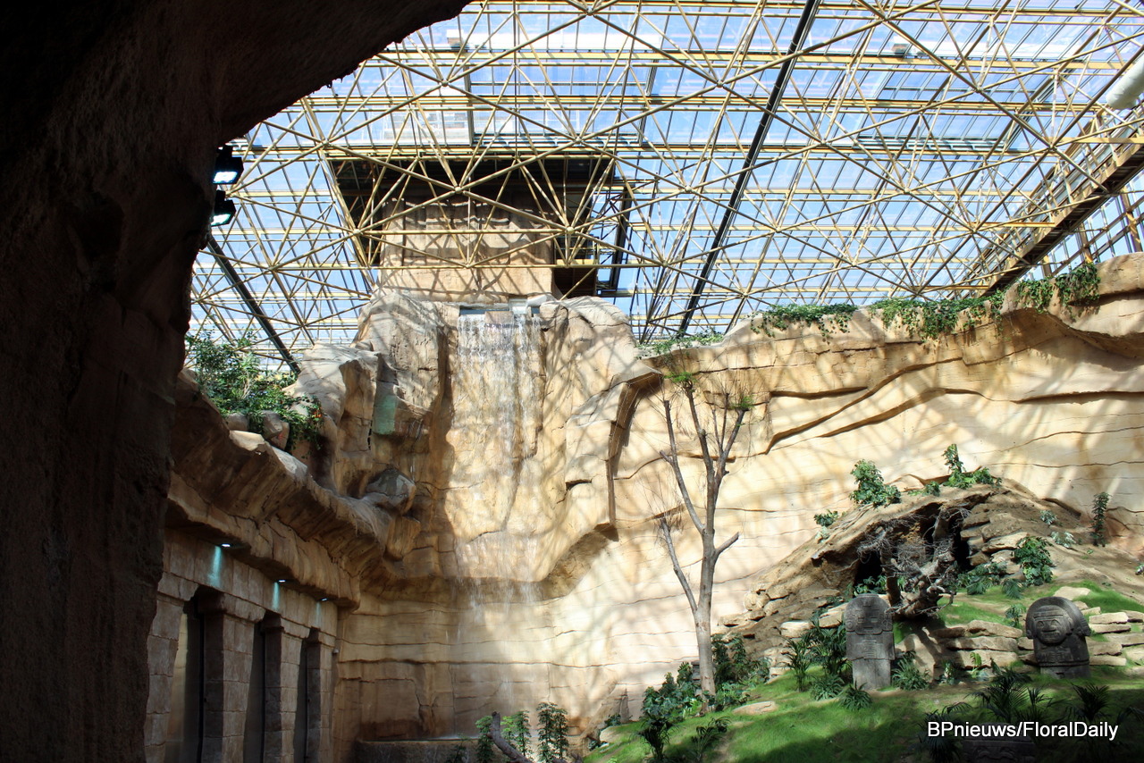 Behind this waterfall is an elevator that allows employees to reach the roof of the greenhouse