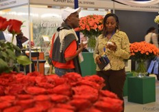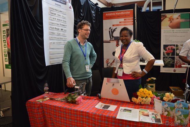 Floris Muilwijk of UFO Supplies and Fridah Kabiritu of Red Lands Roses talking about the Flower Binding Contest. Participants had to bind six bunches of flowers together. The time it time it takes was registered on the board behind Floris.