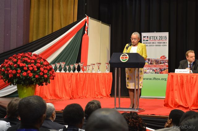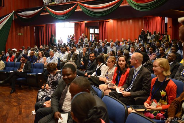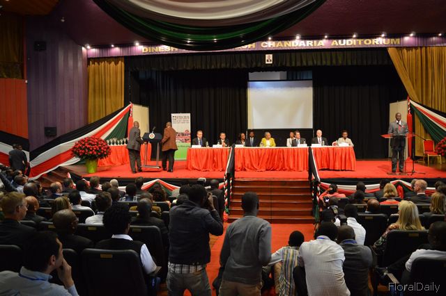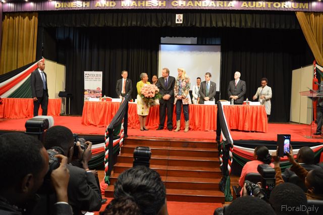 The opening cermony. From left to right: H.E. Joost Reintjes, Ambassador of Netherlands to Kenya. H.E. Tatsushi Terada, Ambassador of Japan to Kenya. Ms. Sicily Kariuki, Principal Secretary of Agriculture. Margaret Keyatta, the first lady of the Republic of Kenya. MR. Richard Fox, Chairman Kenya Flower Council. Mr. Dick Van Raamsdonk, Exhibitions President. Mrs. Jane Ngige, CEO Kenya Flower Council.