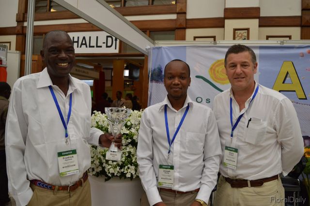 Fredrick Ogweno, Joseph Ndana and Chris Linoley of Oserian in front of the Phlox White Cap that won the Best Flower Quality Award.