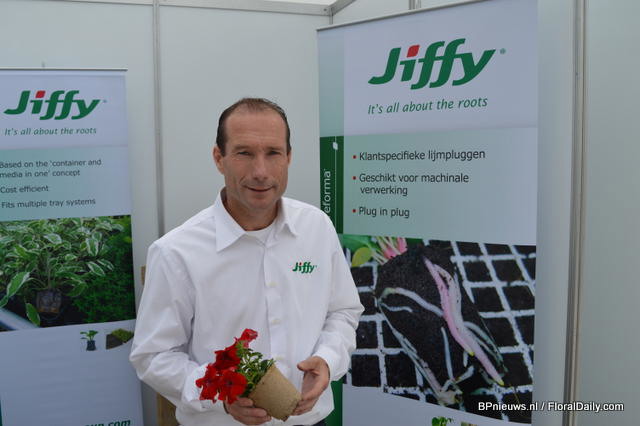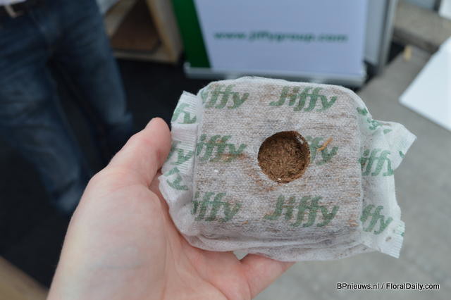 Sander Clemens of Jiffy presents compostable pots. It takes 12-15 weeks to compost the new ones of Jiffy.