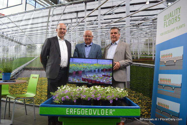Hugo Paans, Piet Rutten and Cock van Bommel of Erfgoed. During the FlowerTrials, they are presenting their eb and flood floors. These floors enables growers to better irrigate the plants and to control the climate.