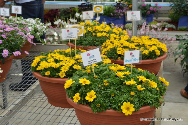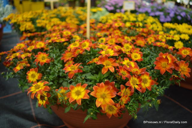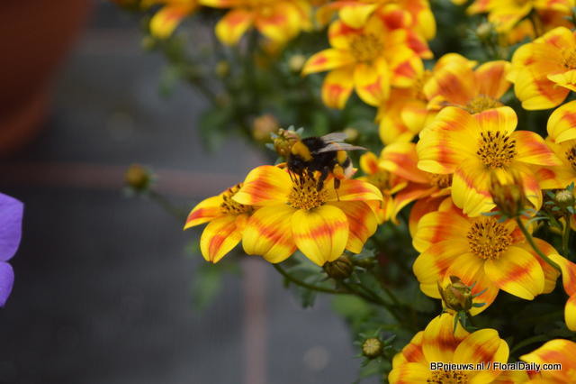 Bidens Bee Giant Yellow ofCohen. This bidens is compact and has large flowers. Also this plant received a lot of attention during the FlowerTrials.