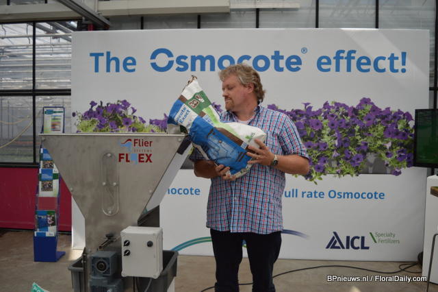 Riny WestDijk of ICL Specialty Fertilizers pooring fertilizers of ICL Specialty Fertilizers in the Osmocote of Flier Systemes. The fertilizers can offer a solution for several problems during cultivation; shelf life in the chain, lowering of the emission, fertilizing plant specific and separation of water and fertilizers.