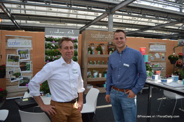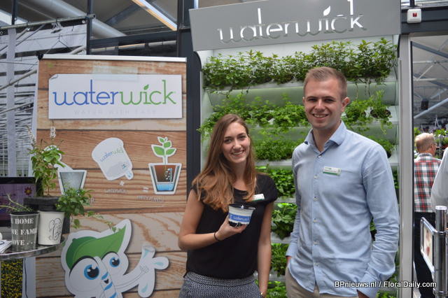 Marleen van Haaften and Robert Jan in ‘t Veld of Waterwick with a 12 cm pot with the Waterwick stick. The string irrigates the plant. Therefore, the customer does not have to water its plant that often.