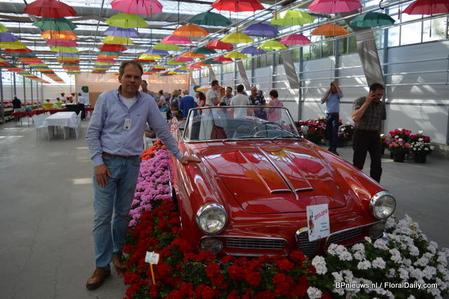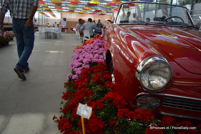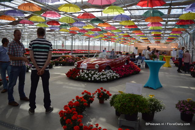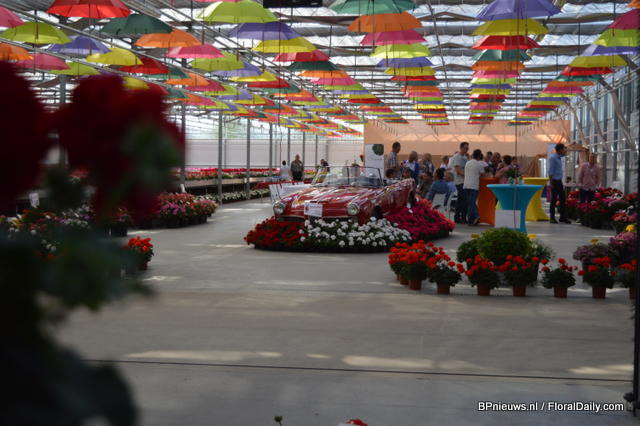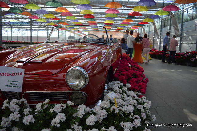 The new pelargonium varieties of P. v.d. Haak around the Porsche; five new varieties: Paula, Eva, Kasech en Emma.