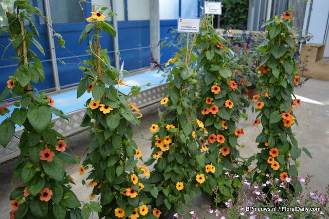 Thunbergia Alata Arizona Terracotta is a new colour addition; terracotta flowers and a dark centre. The large amount of terracotta flowers will last from spring to autumn. They are suited for mixed hanging baskets and pyramids for patio and decks, a showy cover for arches and pergolas.