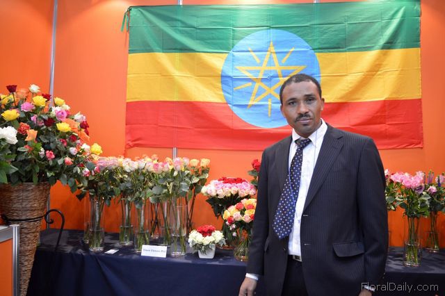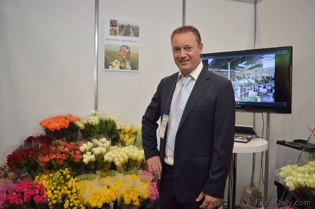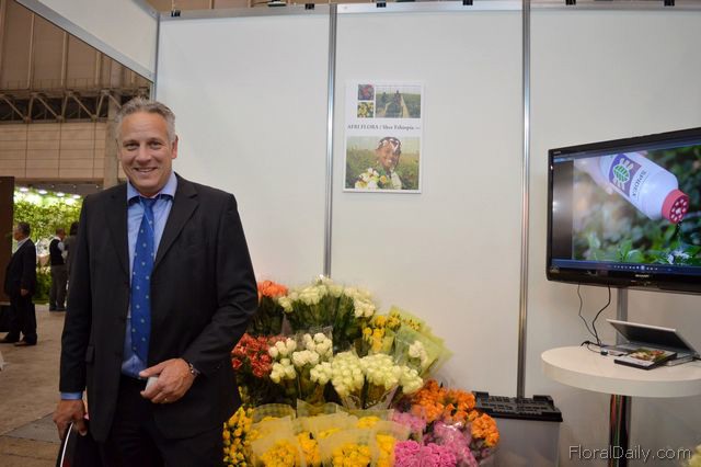 Peter Barnhoorn of Afri Flora. They produce roses in a 420 ha sized greenhouse in Ethiopia. Every week they are adding 1 ha, till they reach a total size of 600 ha. Their cultivation is biological. They are at the show to look for possibilities to export to Japan.