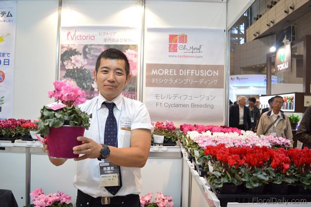 Shinichi Ema of Kaneya holding the Falbala rose of Morel Diffusion, a French breeder and propagator of Cyclamen who has its own stand at the show. Originally, Kaneya manufactures pots