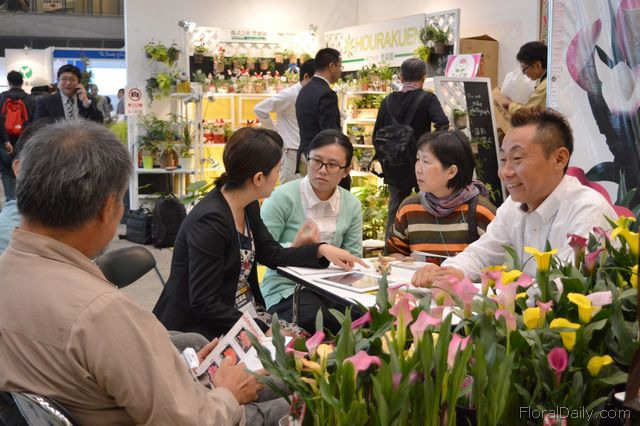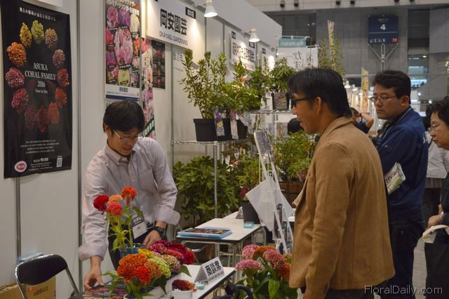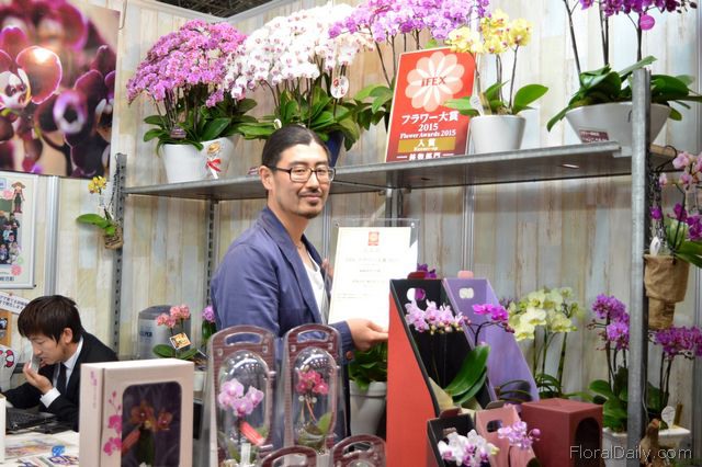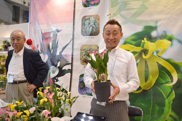 "Issei Yamaguchi of Asuken Co. For the third time, Yamaguchi is attending the IFEX. He grows oriental lilies and the "Asuka Coral Family". These are flowers that look like coral. he produces 400,000 coral flowers and 250,000 oriental lilies per month in a hoop house and a plastic greenhouse in Japan. At the show, he is presenting the coral flowers, which he also breeds. His current assortment consists of 20 colors. According to Yamaguchi, the green color is the most popular one and the orange color is increasing in popularity because of the increasing popularity of Halloween."
