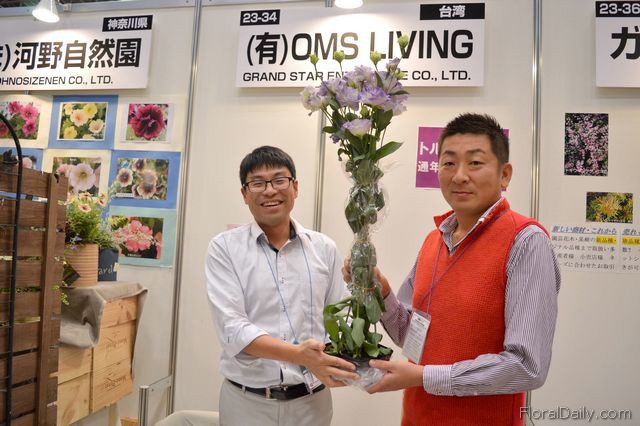 Lin Seika and Yosuke Satoo of Grand Star holding their lisianthus in pot. They are a lisianthus grower and specialized in growing lisianthus in pot. According to Seika, growing lisianthus in pot has a large advantage that the soil does not have to be cleaned every three years, because this is very expensive. Another advantage is the fact that the lisianthus are grown on a bench. Therefore, harvesting of the lisianthus is easier. They have a greenhouse in Japan and Taiwan and are therefore able to supply yearround; from January till March, the lisianthus come from Taiwan, from Marchi till June and from August till October from Japan.