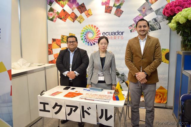 Jose Sanchez Posligua, Yasuko Kobayashi and Cristobal Albam of Pro Ecuador, the commercial section of the Embassy of Ecuador in Japan. Pro Ecuador promotes the Ecuadorian products in Japan, including the Ecuadorian rose.