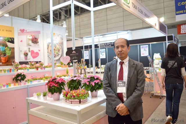 Eiji Kageyama iof Nanahoshi standing next to the Poinsettia of Suntory. Nanahoshi is a Japanese company that buys Japanese plants and flowers and sells them in Japan.