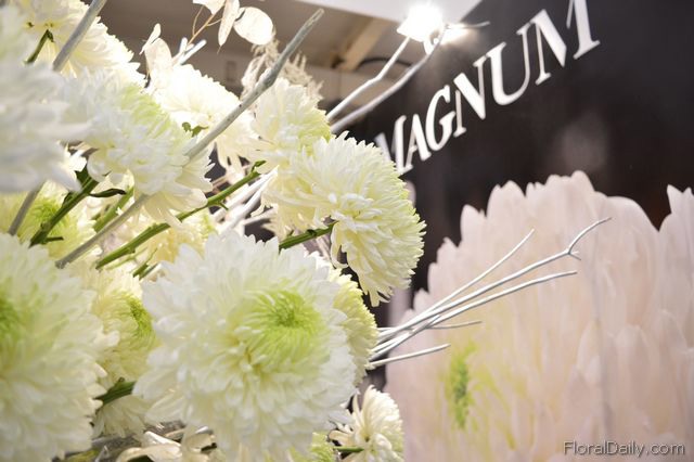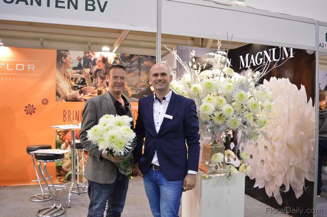 "Ronald Olsthoorn of Arcadia Chrysanten and John Elstgeest of Deliflor. At the show, their new chrysanthemum variety, called the Magnum, takes center stage at the Deliflor booth. "It's only been on the market for three weeks now, and at the exhibition it is attracting the attention of many visitors", says Elsgeest. The variety's grower, Olsthoor, is also pleased with the appearance and growing habits of the flower. "Weekly, we produce 2,500 of these chrysanthemums and we are planning to double the production this fall", he says."