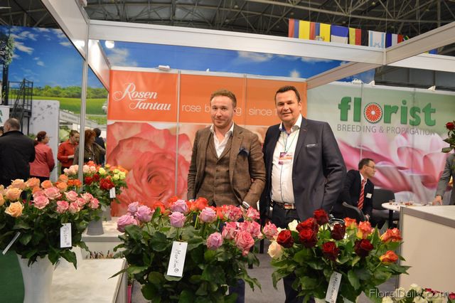 "Alexander Brjuhins of Rosen Tantau and Stein Schouten of Florist Breeding. Rosen Tantau's first rose delivery was in 1996, and since 1998 they've been active on the Russian market. At the show, Brjuhins recognizes that people are looking for new varieties and that they are very interested in the roses with clear and contrasting colors. Their yellow and red rose for example (on the right side of the picture) is still in its test phase and caught the eye of many visitors. "The colors are very contrasting", says Brjuhins."