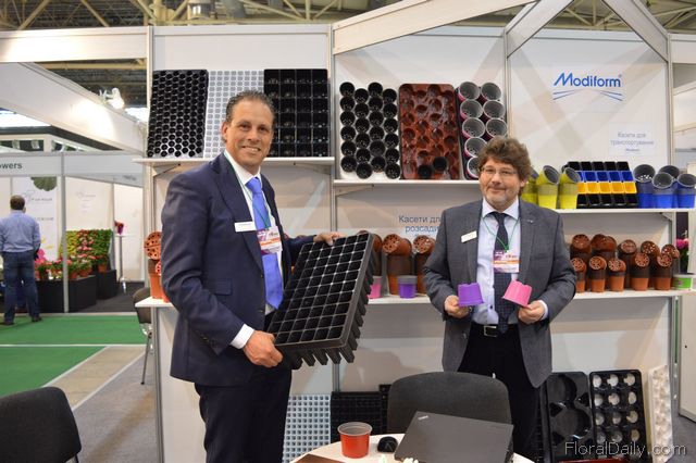"Kees van Beek and Krysztof Banas of Modiform. Beek is holding a tray to propogate trees. According to him, more trees are being produced in Ukraine and by using a tray like this, the productivity can be increase. Banas is holding two colored pots. According to him, there is a growing demand from the consumers side for these pots, so the growers will follow. Using colored pots is quite new for Ukrainian growers. For Modiform, Ukraine is a potential market. "We see that the consumers really love flowers and plants and therefore we are positive regarding the improvement of the situation."