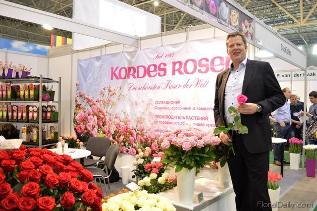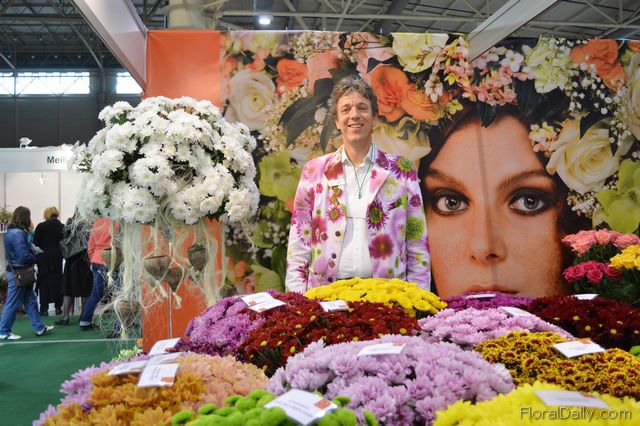 "Rick Minck of Dümmen Orange. The are participating at this exhibition to showcase their assortment in chrysanthemums, gerberas, roses and anthuriums. He is standing next to a new variety that has been introduced on the Ukraine market lately; the Pina Colada. According to Minck, the people are very positive even though the crisis. "I we've had the worst part", he says."