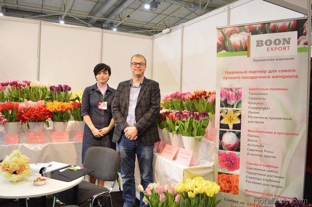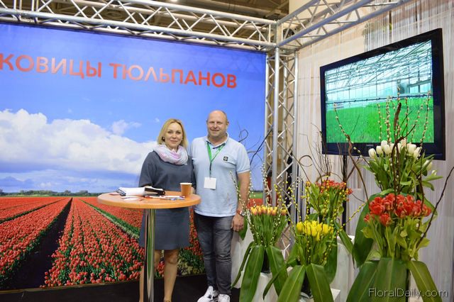 "Olga Pilipenka and Mark van Ruiten of Van Ruiten. Van Ruiten is a large tulip grower in the Netherlands, Around 40 million tulips are being grown from own bulbs. They grow bulbsize 10 and 11. They also have bulbsize 12, but this size is only used for export as it they will produce larger tulips. This year, they became an exporter of bulbs. Van Ruiten wants to put these 12 sized bulbs to White Russia and Ukraine. According to van Ruiten, the demand for roses decreases and for tulips and other flowersbulbs increases. "For this reason we entered this market. As we are growers too, we cannot only give advise regarding varieties, but also about the cultivation of this flower. At the show, we received a lot of questions and we are pleased with the amount and quality of visitors. This gives us hope", syas Van Ruiten."
