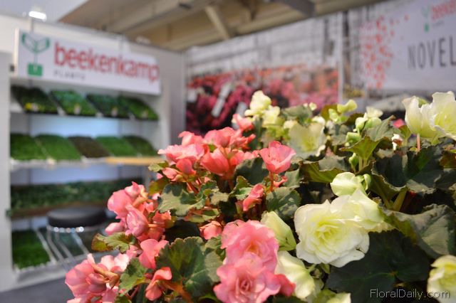 Tamara Elsgeest of Beekenkamp with one of her clients. They've been participating at the exhibition for three or four years. According to Elsgeest, the demand for begonia and cyclamen young plants is increasing as imported plants are expensive, due to the currency rate. And this year seems to be better than last year.