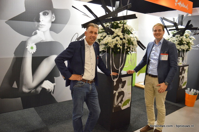 Royal van Zanten choose to focus its presentation on one single, new white chrysantemum, which will, hopefully, kick Bacardi out of the market. On the picture: Reinoud Hagen and Peter Wouters