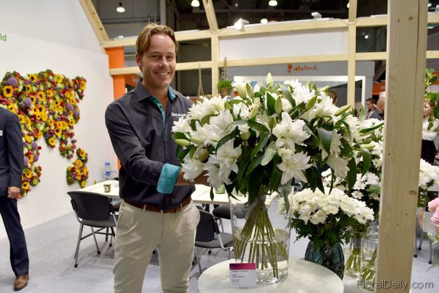 One of the popular novelties in the FloraHolland pavillion is the lilium Monica Roselily’s, in the photo presented by Jaap Moerman of Moerman Lilies. The dubble flower of this variety es part of the reason the variety is popular, just as the fact that is has no stamper so allergies are no problem.