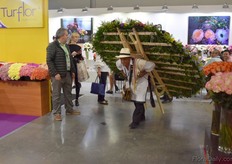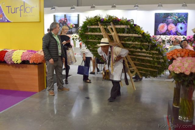 Almost all exhibtitors of the Colombian pavillion in front of the floral displays, called silleteros. Every year, in the beginning of August, over 500 men are making these displays and carry them on their back through the city of Medellin. The majority of the flowers are donated by Colombian growers or are coming from their own gardens.
