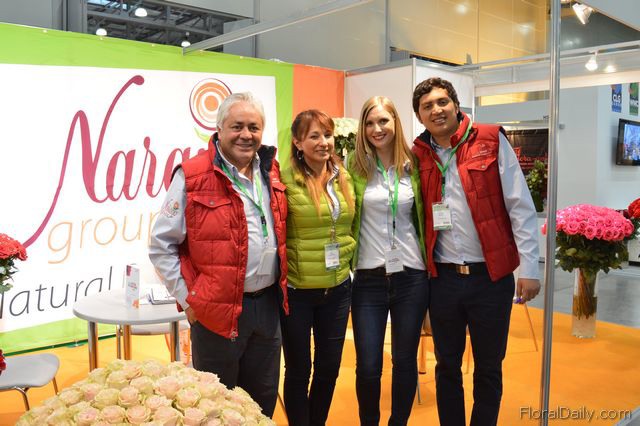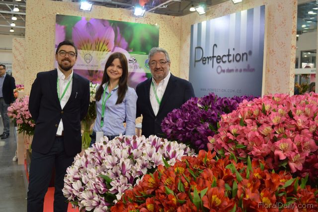 Pablo Bazzani, Ekaterina Shmatova and Camilo Bazzani of La Plazoleta. At the exhibition, they are promoting their Perfection branded alstroemerias. The four varieties in on the picture (Palermo, Marshmallow, Hot Pepper and Nora) are their new varieties.