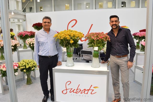 Naren Patel and Ravi Patel of Subati Flowers showing cut kalanchoes next to their broad assortment of roses. They are currently trialing these kalanchoes at their farm in Kenya. They brought them to the show to find out if there is a market for these flowers. And there seems to be one. At the show it caught the eye of many visitors.