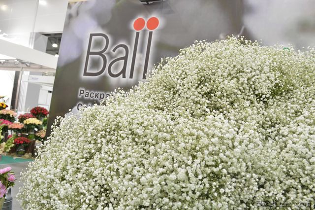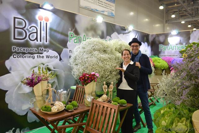Lourdes Reyes of BallSB and designer Pieter Landman. They are presenting their flower varieties to the Russian buyers and if they are interested in buying them, they will bring them in contact with the right grower. On this picture Lourdes and Pieter are presenting the new gypsophila snowball. Their booth was the Winner of the Competition: The best display design.