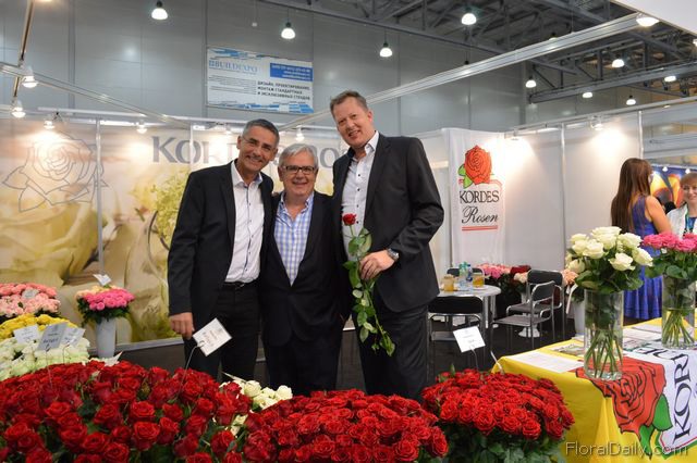 The team of Kordes Roses. Göran Basjes (on the right) is holding the Con Amore, a new red rose variety. In the middle their agent in Russia Vladislav Metelitsa of the company Demetra.