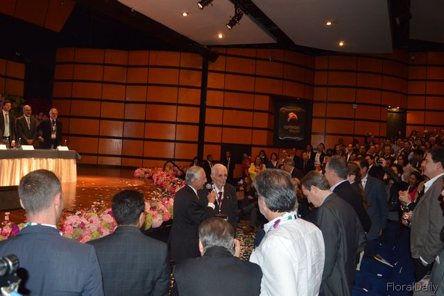 "Sergio Arango of Capiro presenting the prizes that the company won during the show. In the category producers, their disbud chrysanthemum Chipsa won the first prize in "Best in Category" in the category disbud chrysanthemum and Magnum, the second prize. In the spray chrysanthemum category, their Baltica won the second prize."