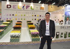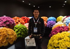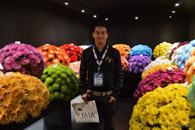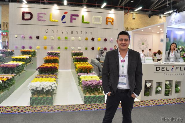 Juan David of Deliflor. According to David, Deliflor is the biggest chrysanthemum breeder in Colombia as around 45 percent of the production consists of their varieties. Every year, they bring in about 20 new varieties. At the show, they put them on display to show growers and US brokers their assortment.