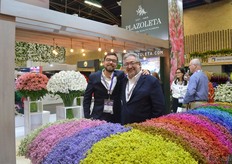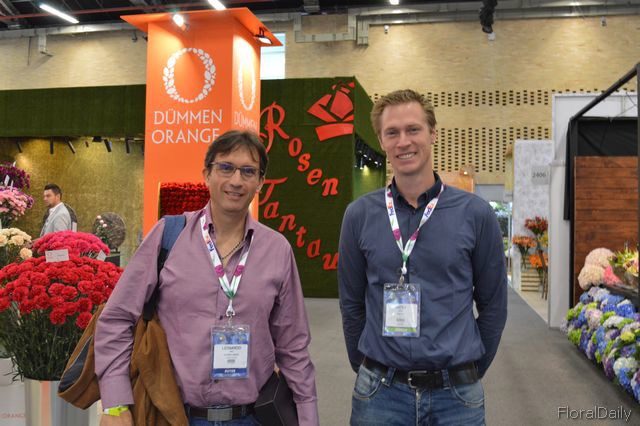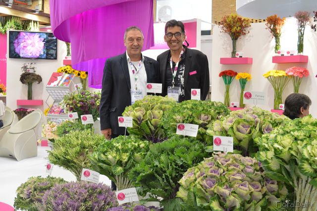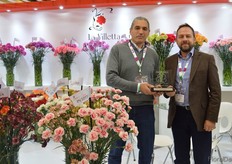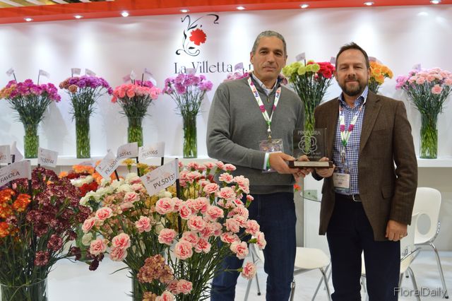 "Gianfranco Fenoglio and Mauricio Jiminez of La Villetta. He breeds and produces young plant carnations. The majority of the young plants are being produced in Colombia and around 15% in Italy. At the show, they won the first prize "Best in Category" for their spray carnation that still has a code."