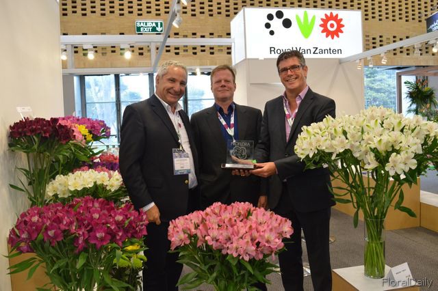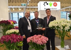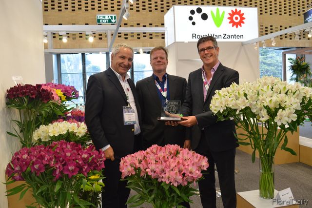 "Luis mariano Botero of Plantas y Bulbos with John Damen and Kees Gran of Royal Van Zanten. With their alstroemeria Posh Pink, they won the first prize "Best of Category" in the category astroemeria."