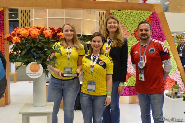 "The Colombian team of Royal De Ruiter presenting the first prize "Best in Category" they won for their Pink X-Pression in the category roses."