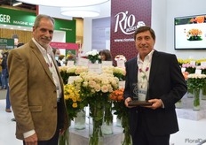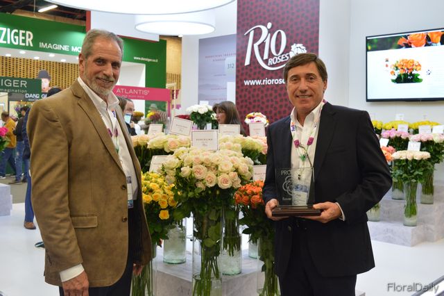 "Raul Marrera and Victor Giorgini of Equiflor presenting their first prize "Best in Category" for their spray rose porcelina in the category Growers- Spray rose."
