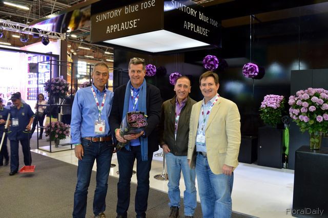 Masashi Matsumura of Suntory Flowers , Mario Vicente of Fresca Farms and Dr. Ivan Rodrigo Artunduaga and Cory Sanchez of Florigene presenting the new blue rose, Applause. At this the Proflora they were presenting Applause for the first time.