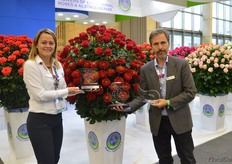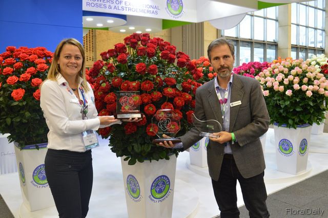 "Olga Perdomo and Michael Vaughan of Grupo Andes Farms holding their awards. They are the Grand Champion among the growers with their rose called Red Eye. This rose also received the first price for "Best in Category". And this all on top of the Acknowledgement award they received from Florverde that morning."