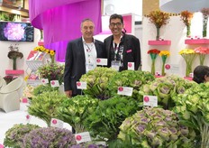 Nicolaas Grootendorst of Evanthia and Juan Alejandro Guaqueta Trading. Guaqueta reprents Evanthia in Colombia. On the picture the brassica's of Eviantha in the booth of Guaqueta.