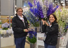 "Juaquin de la Torre and Lourdes Reyes of Ball Colombia. They are Grand Champion among the breeders with the delphinium Dark Angel, bred by Agriom. (Ball Colombia is Agriom's agent in South America). This variety also won the first prize "Best in Category" and Ball's Gerbera Spot Light and Stock Spray Vintage Rose both won a second prize "Best in Category" and their Gerbera Dreamline a third price "Best in Category"."