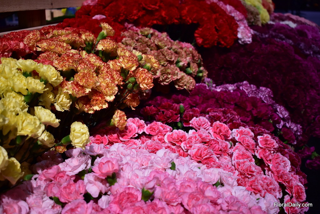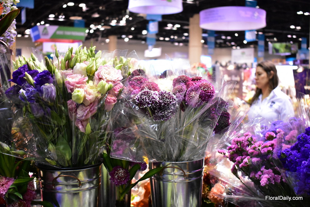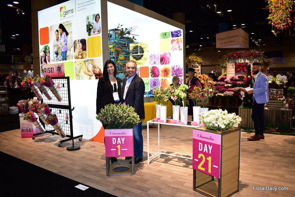 Dyanna Paz and Carks Oramas (chosen as PMA 2018 Floral Marketer of the Year) of Gems Group showing the Charmelia. On the left the Charmelia on day 1,  on the right on day 21 and in the middle the new colors that they are trailing at the moment. It is a new type of flower, bred by Royal van Zanten and grown by Jardines de los Andes in Colombia. According to Oramas, the flower works well as straight bunch and in bouquets. Gems is supplying Charmelia in the US for three years now and the demand is increasing. Together with another US company, they are the only two supplying the Charmelia. More on this later in FloralDaily.